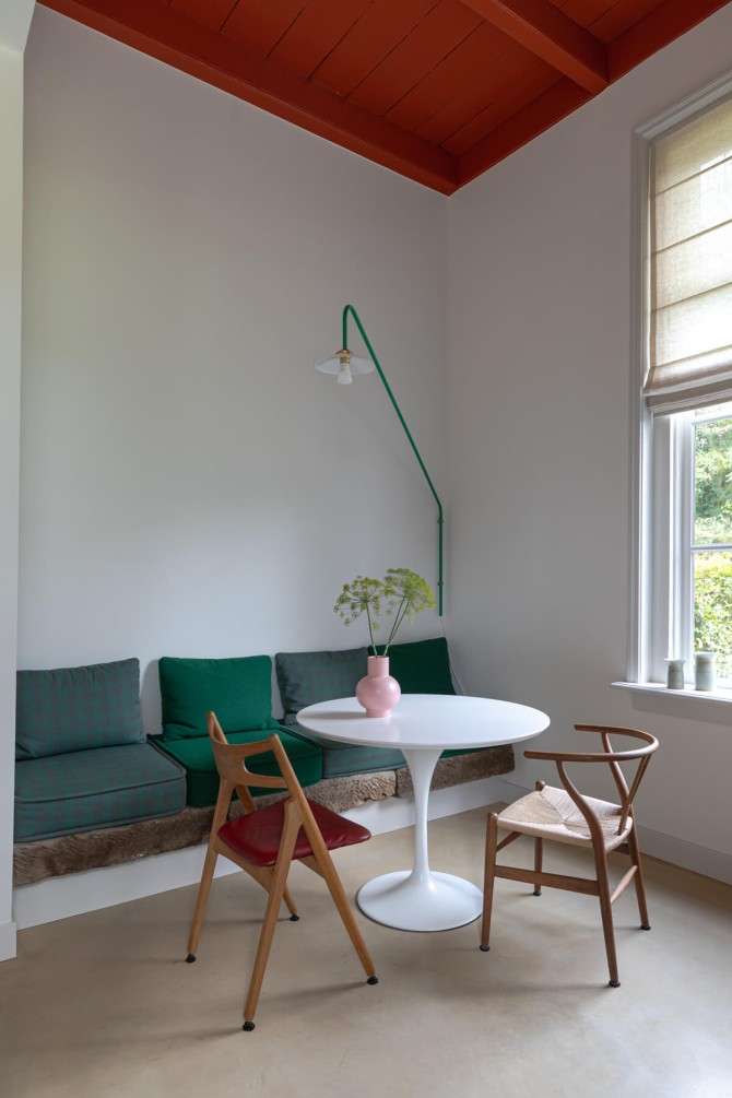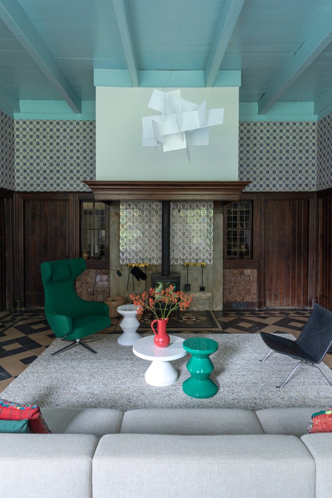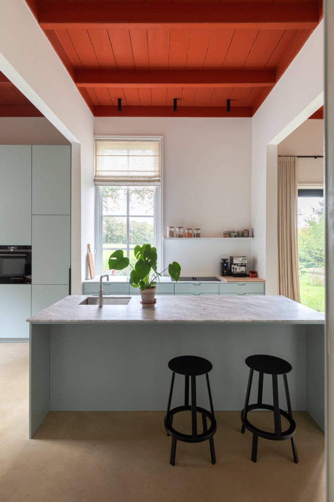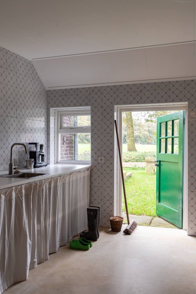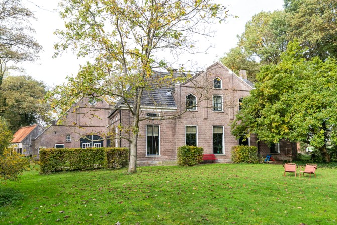 Dit bijzondere landgoed is een Rijksmonument. De bakstenen boerderij met een grote tweekapschuur is gebouwd in 1905. schipperdouwesarchitectuur heeft het masterplan gemaakt en Groen & Schild wonen dacht mee over het interieur. Het gebouw en het interieur bevatten opmerkelijke detailleringen. Bijzonder is ook de woonkamer met een getegelde lambrisering en wanden. Samen met de andere gebouwen op het erf vormt de boerderij een historisch ensemble: het is alsof de tijd heeft stilgestaan. Binnen hebben we met respect voor het monument een eigentijds interieur ontworpen. Door het toepassen van heldere kleuren: steenrood en kalkblauw ontstaan karaktervolle ruimten. Oude elementen zijn hergebruikt zoals de Bentheimer stenen uit de haard, waar een bank van is gemaakt. Oude en nieuwe meubels zijn gecombineerd en de nieuwe pui in de keuken zorgt voor licht en contact met de tuin. Op deze manier hebben we een nieuwe laag toegevoegd aan het historische familiehuis.