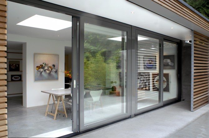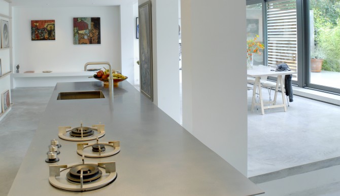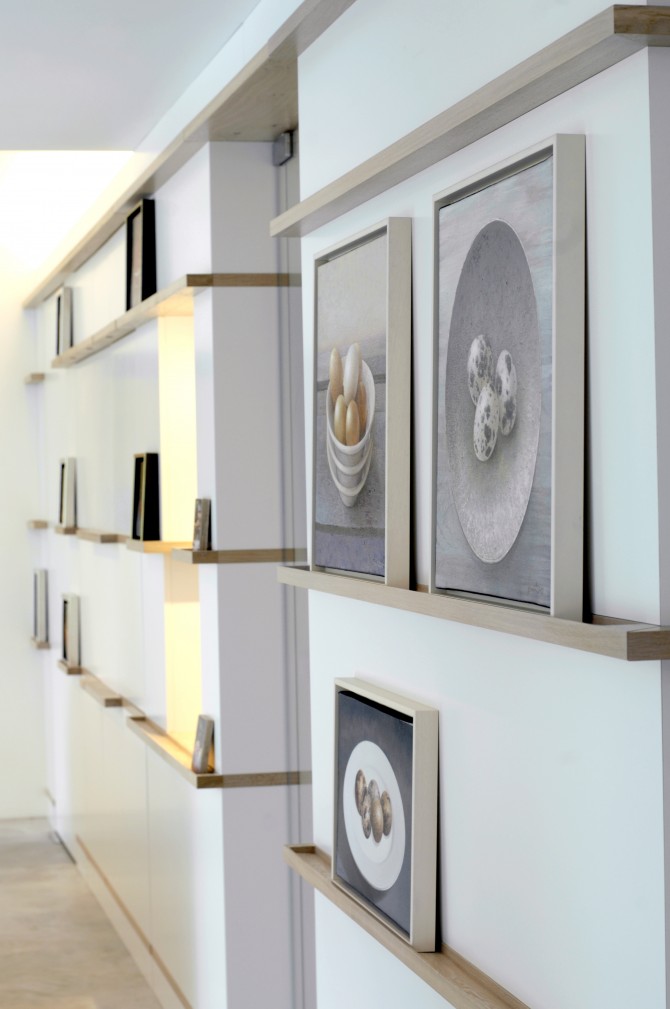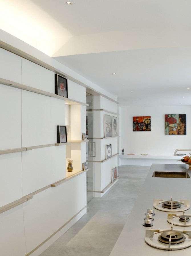 Maak van onze woning een galerie, dat was de vraag van Arne en Karin. Om dit te bereiken moesten we wel wat wanden weghalen. Daarvoor in de plaats kwam een wandelement, waar we zo veel mogelijk in hebben weggewerkt: apparatuur van de keuken, kasten en een werkplek. Wat overblijft is een ruimte die gebruikt wordt om te wonen en te exposeren. De betonnen vloer loopt door in het terras en in betonnen vlakken in de tuin. Hierdoor ontstaat letterlijk een verbinding met de buitenruimte. De kast in de keuken en woonkamer doet ook dienst als expositiewand. Op houten latten die ook de grepen van de deuren vormen kunnen schilderijen worden geplaatst. Onze missie is geslaagd: wat eens een hokkerige ruimte was, is nu een prachtige galerie met alle comfort om tussen de exposities door prettig te wonen.