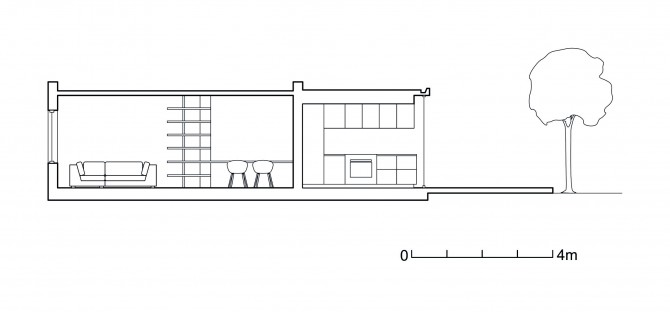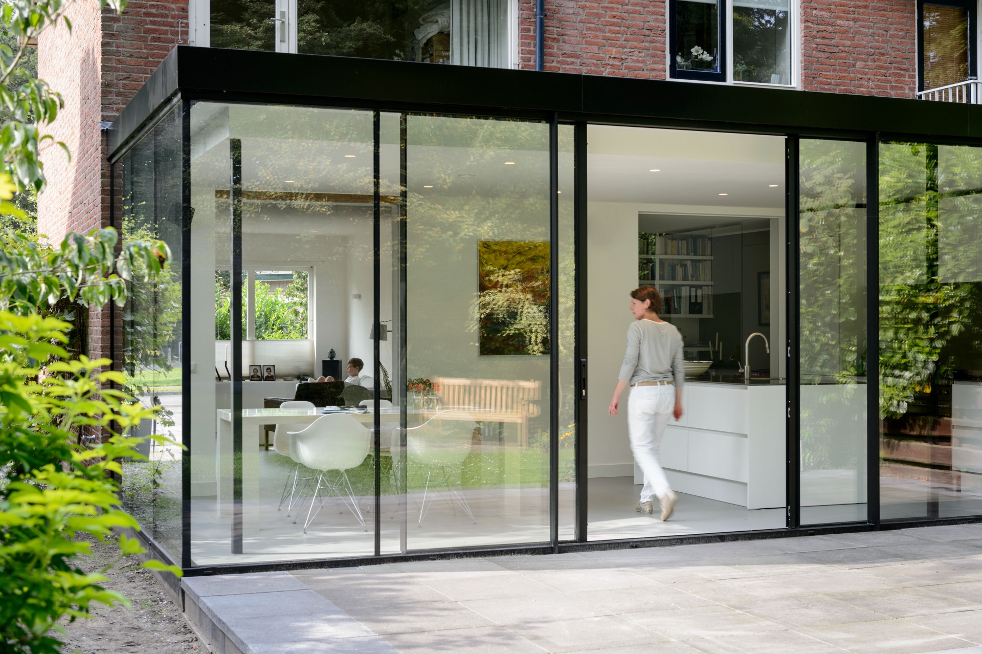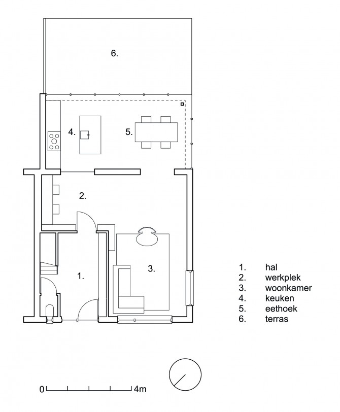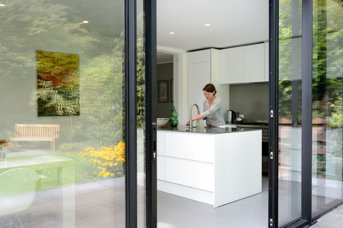 De nieuwe uitbouw en terras hebben exact dezelfde maat als de bestaande plattegrond van de begane grond. Hiermee krijgt het huis uit 1950 veel meer functionele ruimte en blijven de verhoudingen intact. De kamer loopt door in een lichte woonkeuken, vanuit de hal is zicht naar buiten. De constructie van het nieuwe dak is naar binnen geplaatst, hierdoor zijn de kozijnen aan de bovenzijde uit het zicht en lijkt het glas door te lopen. Dit versterkt de ruimtelijke beleving en zorgt voor maximaal contact met de diepe tuin. Binnen en buiten lopen natuurlijk in elkaar over: de ultieme ervaring van vrijheid.