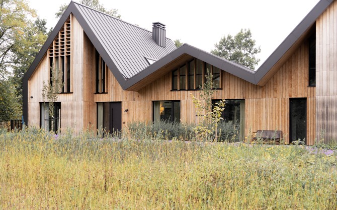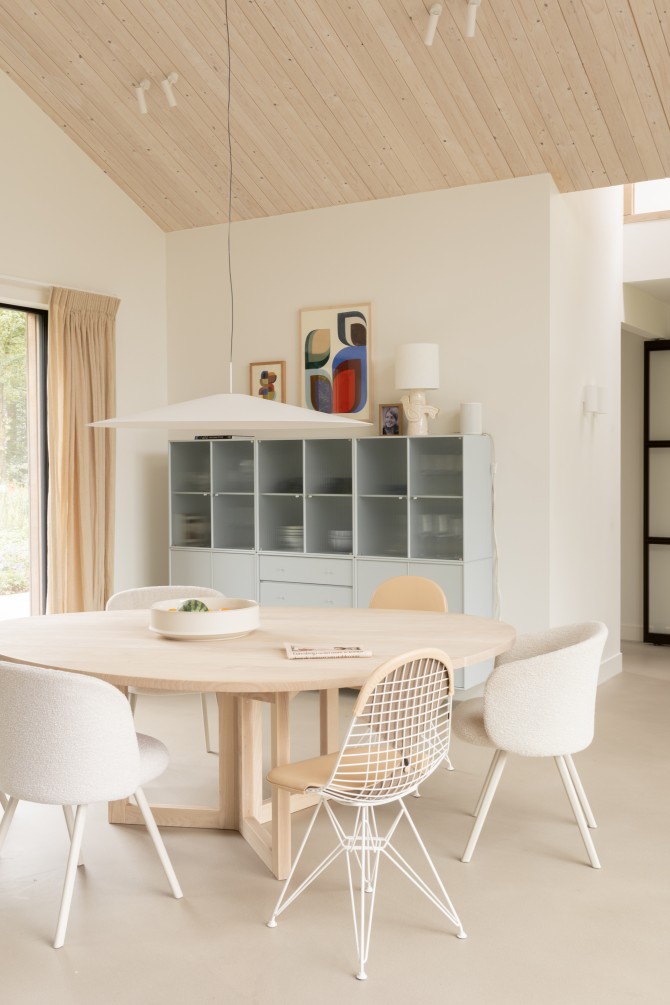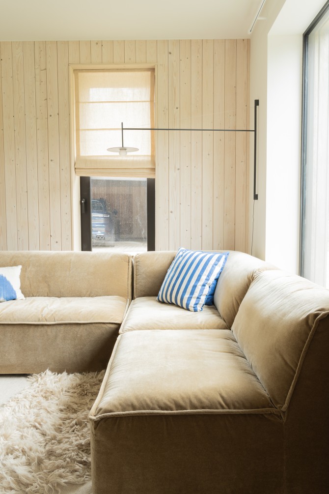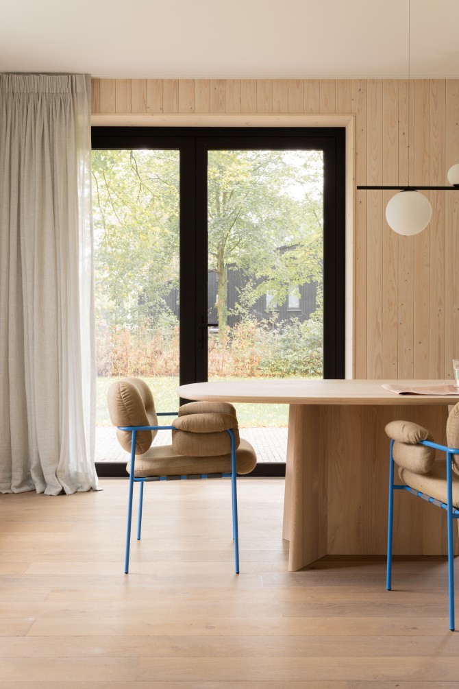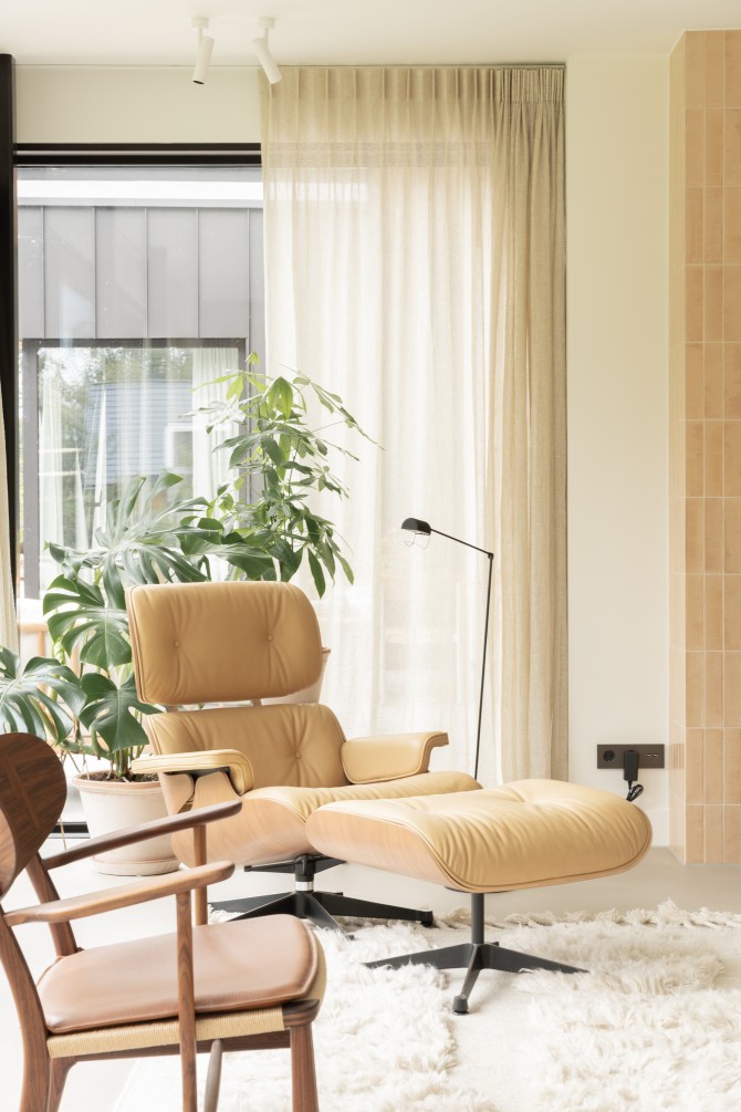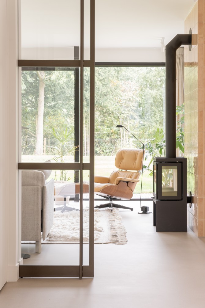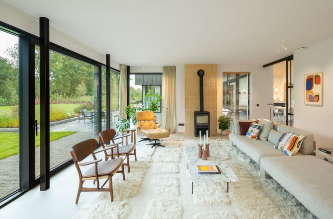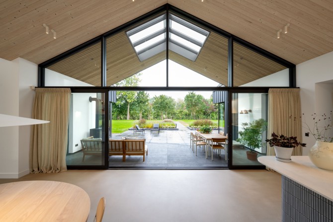 ‘t Vaneker is een voorbeeld van het Twents coulisselandschap. Aangelegd als militaire basis is het nu een woonwijk met vrijstaande woningen omringd door bomen, struiken en waterstromen. De architect heeft met het ontwerp van de villa de natuur betrokken in het ontwerp. De drie volumes hebben ieder een zadeldak en het dak heeft aan de achterzijde een groot overstek, waardoor er een mooie overgang is tussen binnen en buiten. Voor het ontwerp van het interieur hebben we gekozen voor lichte en natuurlijke materialen. Het concept van het doorlopende dak hebben we versterkt door de binnenkant van de kap te bekleden met hout. Vloeren lopen door van binnen naar buiten en de stalen schuifdeuren zorgen voor verbinding tussen de ruimtes. Het hart van het huis is de keuken: vanuit deze hoge ruimte kijk je naar het prachtige landschap. De keuken, kasten en zijn op maat gemaakt. De verlichting zorgt voor sfeer en accentueert de ruimtelijkheid van het huis. De meubels en stoffering passen in de lichte Scandinavische sfeer.
