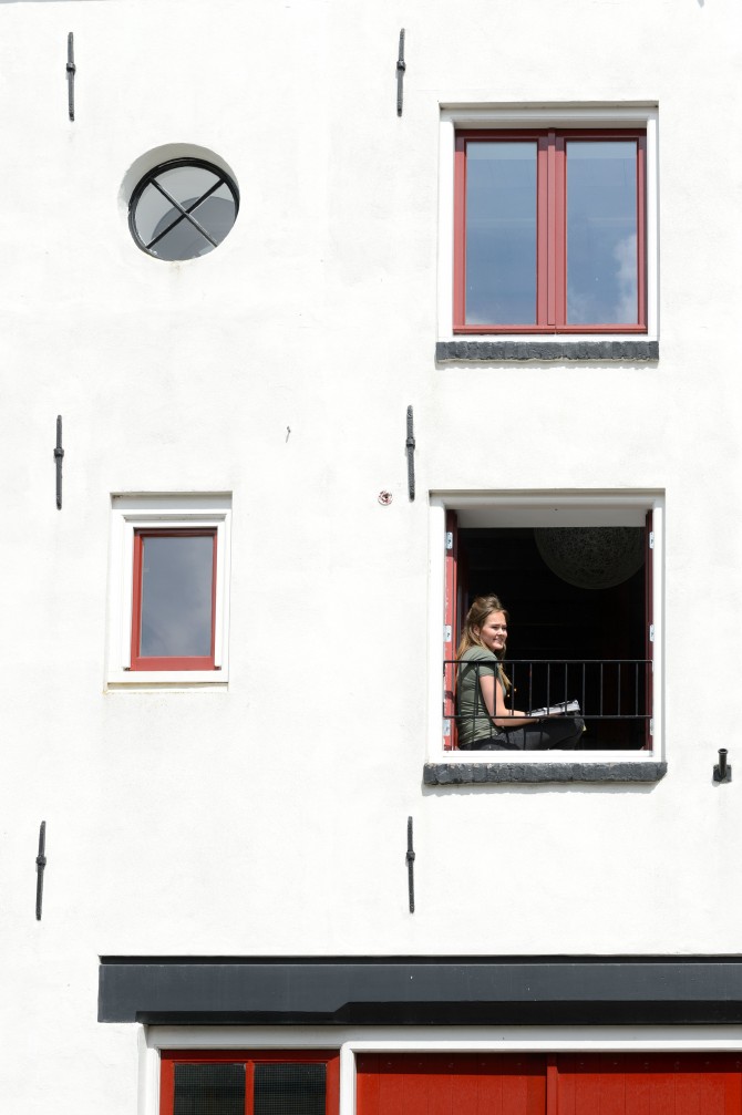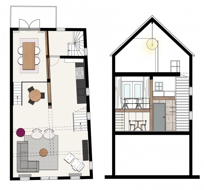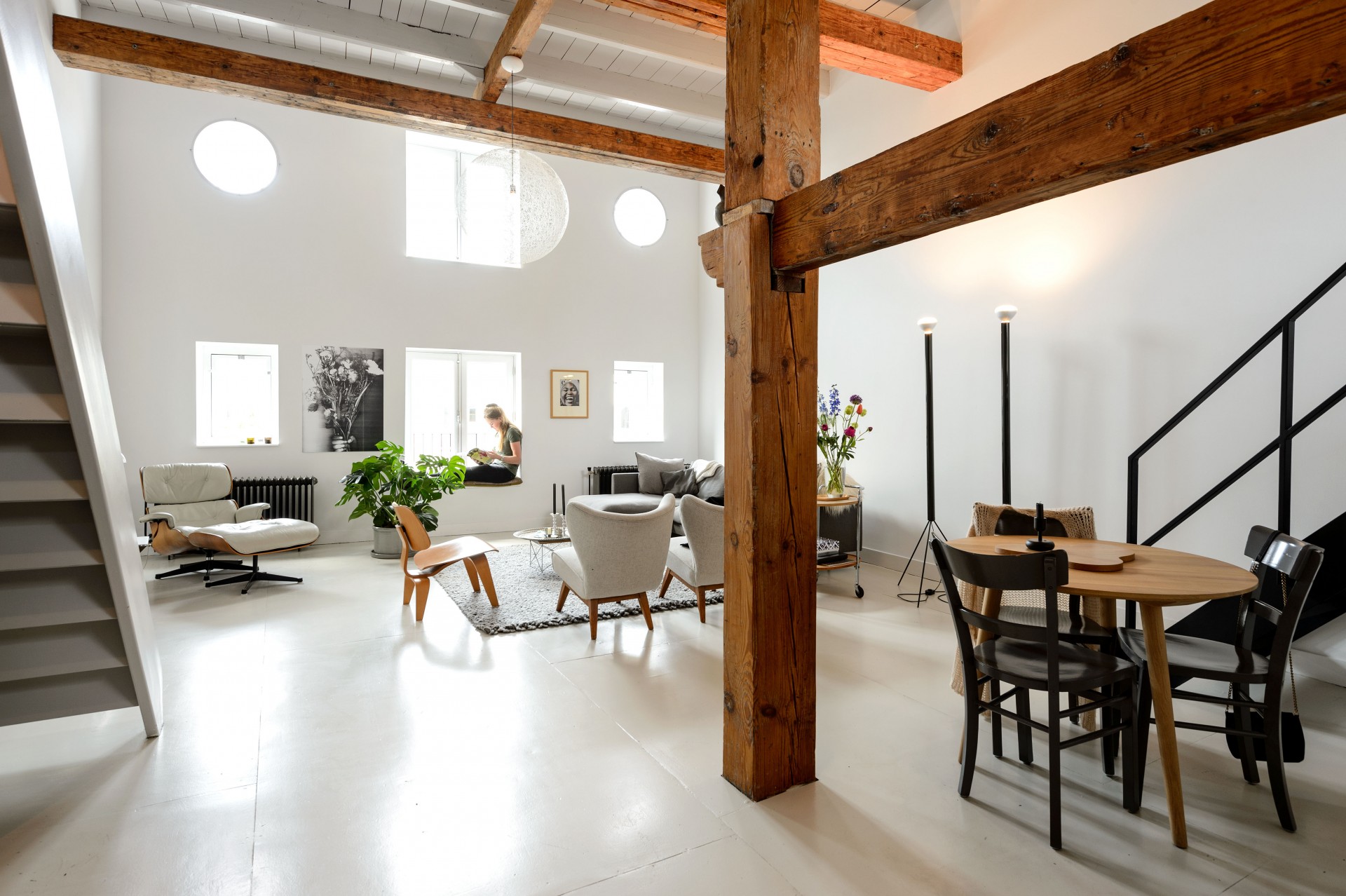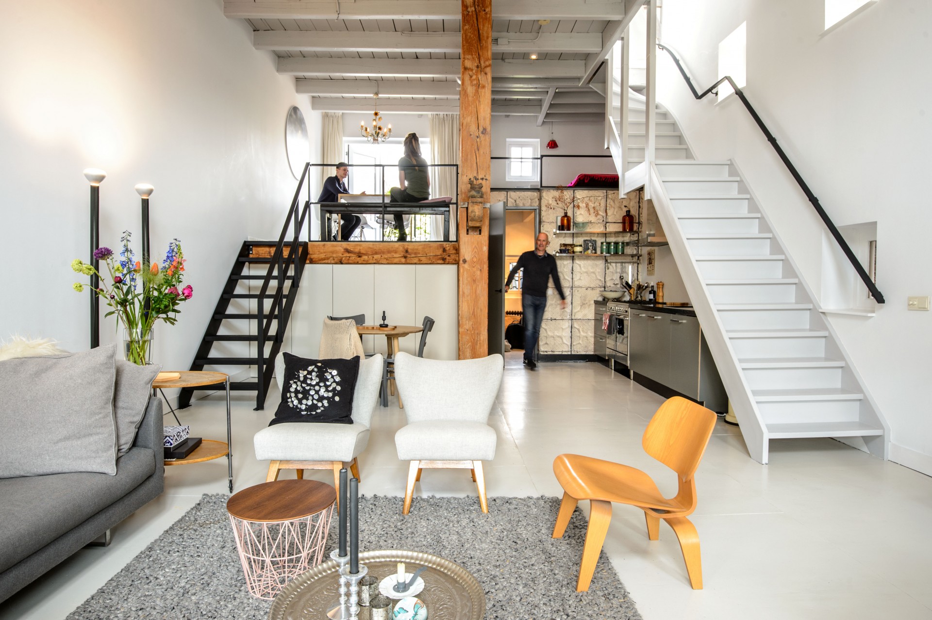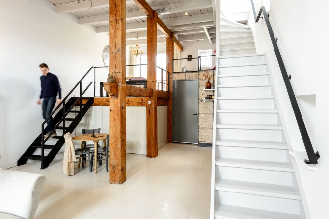 Dit voormalige pakhuis in het Noordenbergkwartier in Deventer is in de jaren negentig van de vorige eeuw grondig verbouwd door een woningbouwvereniging. Studio Groen+Schild heeft met een aantal eenvoudige ingrepen de woonruimte op de eerste verdieping aangepast. De insteekverdieping is kleiner gemaakt, waardoor de oorspronkelijk houtconstructie beter zichtbaar wordt. Onder deze verdieping zijn kasten gemaakt en de trap en balustrade zijn vervangen. Het zwarte staal komt terug in een railing van de bestaande trap. De bestaande keuken is voorzien van nieuwe fronten en een nieuw blad. De ondervloer en het houten plafond zijn geschilderd in lichte kleuren: hierdoor wordt de hoogte van de ruimte extra geaccentueerd.