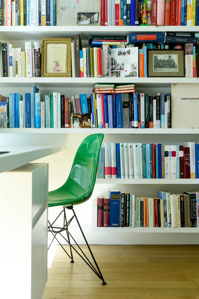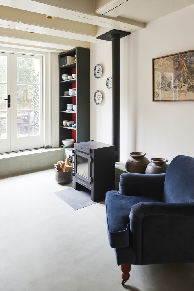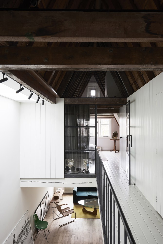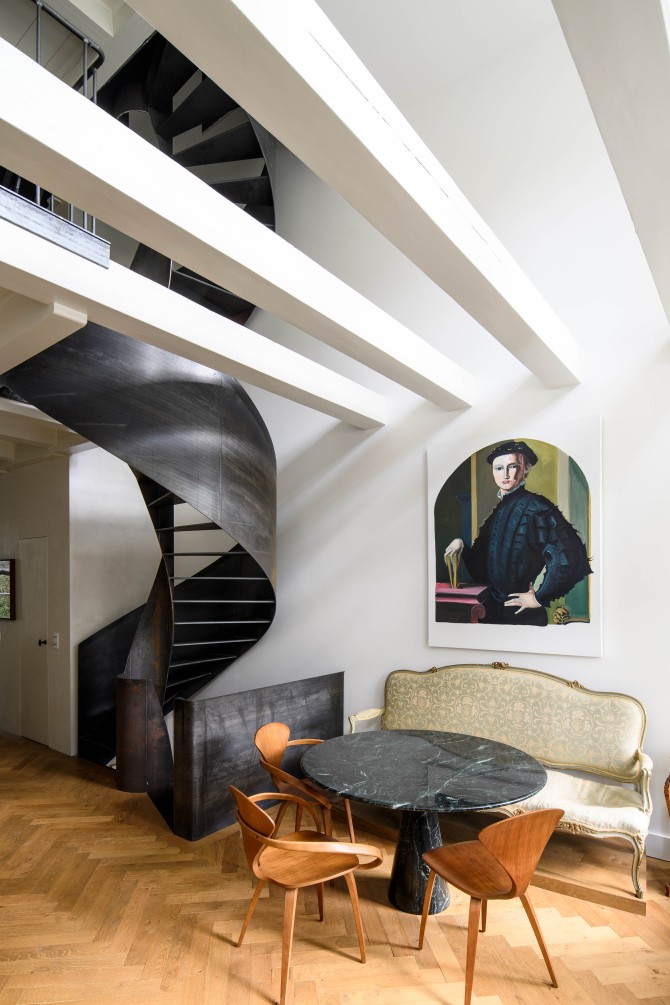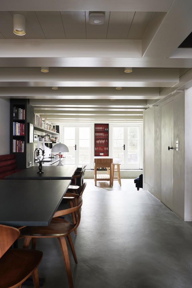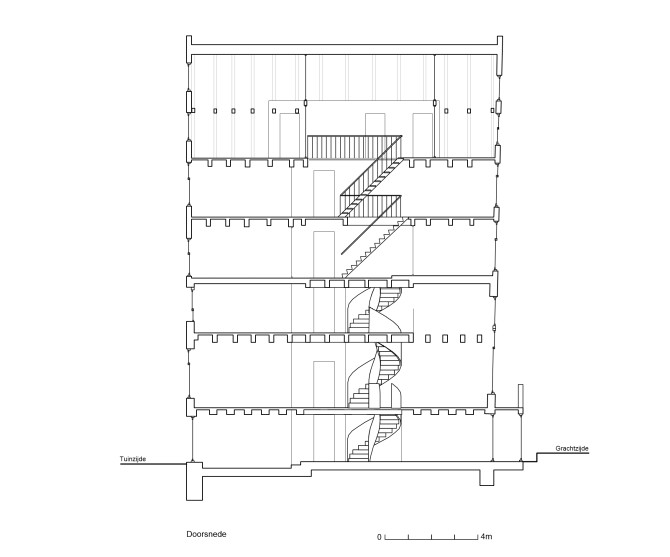 Met de transformatie van kantoor naar woning was er een kans om de oude ruimtelijke structuur van het pand deels terug te brengen. De betonnen kern en het trappenhuis zijn gesloopt en het dak en de vloeren hersteld. Hiervoor zijn nieuwe houten balken en vloerdelen ingebracht. De nieuwe stalen wenteltrap verbindt het souterrain met de tweede verdieping. De bovenverdiepingen hebben een vide en een daklicht in de bestaande dakkapel.