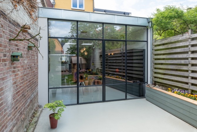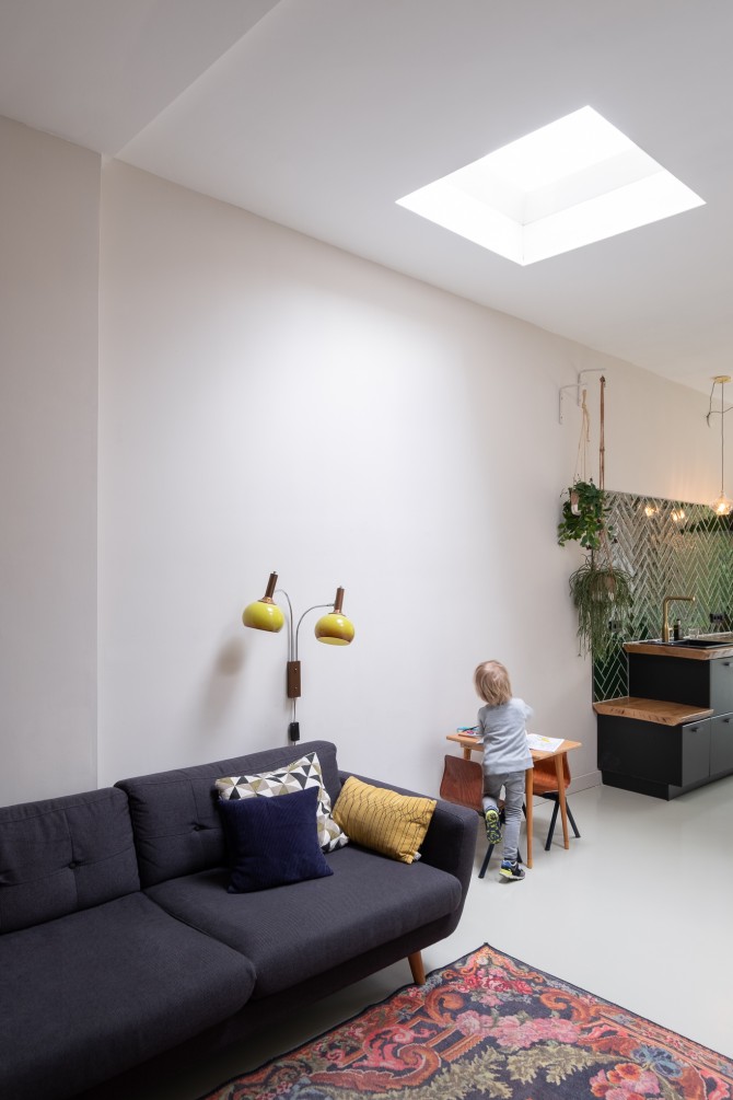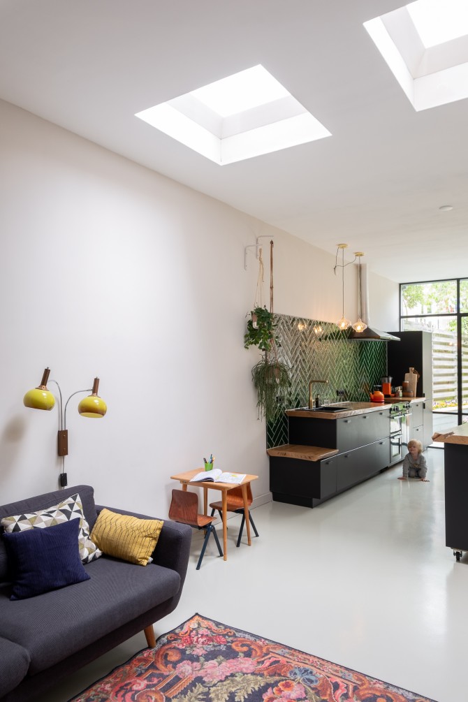 De bewoners van deze stadswoning in Deventer hebben een liefde voor vintage. Originele meubels en lampen uit de jaren zeventig zorgen voor een eigen sfeer in het huis. Groen&Schild Wonen maakte het ontwerp voor de lange en smalle begane grond. Een deel van de bestaande ruimtes aan de achterzijde werd gesloopt. De keuken is verplaatst en de vloer licht geschilderd, doorlopend in het terras aan de achterzijde. De stalen pui en de daklichten zorgen voor veel daglicht in de ruimte. Een mooie stoere basis voor het eclectische interieur.