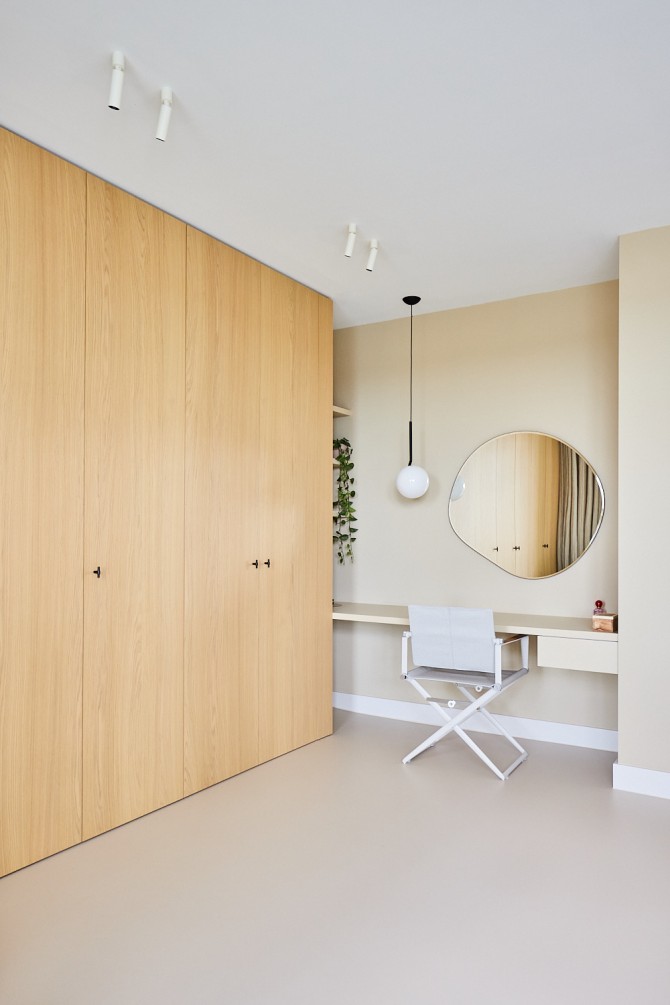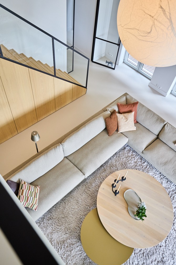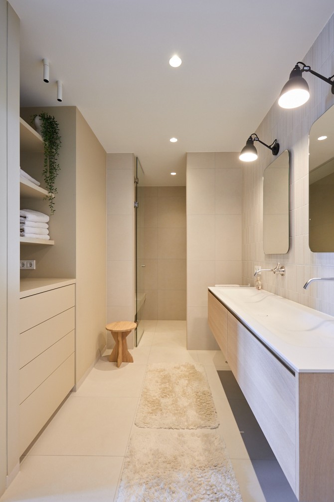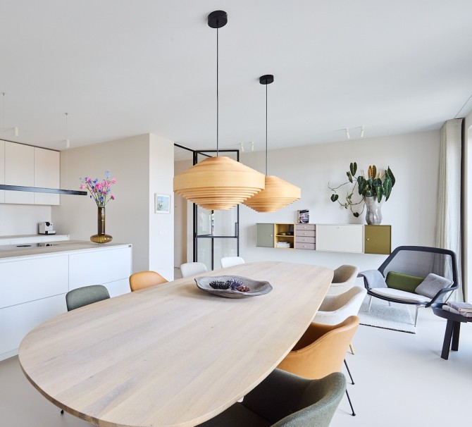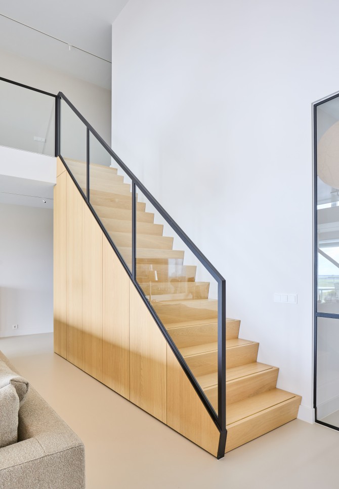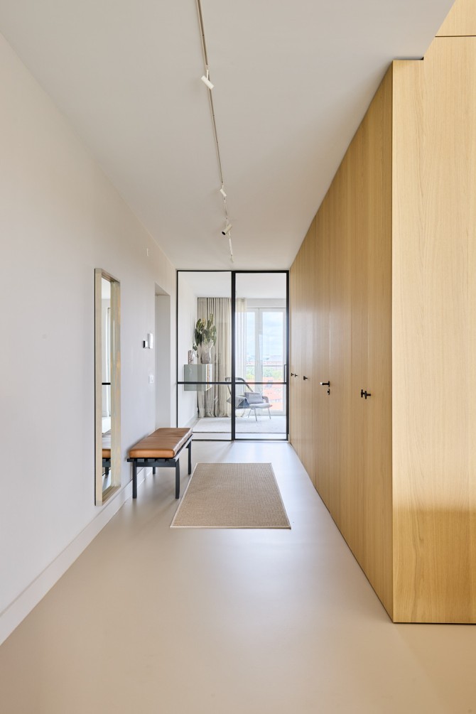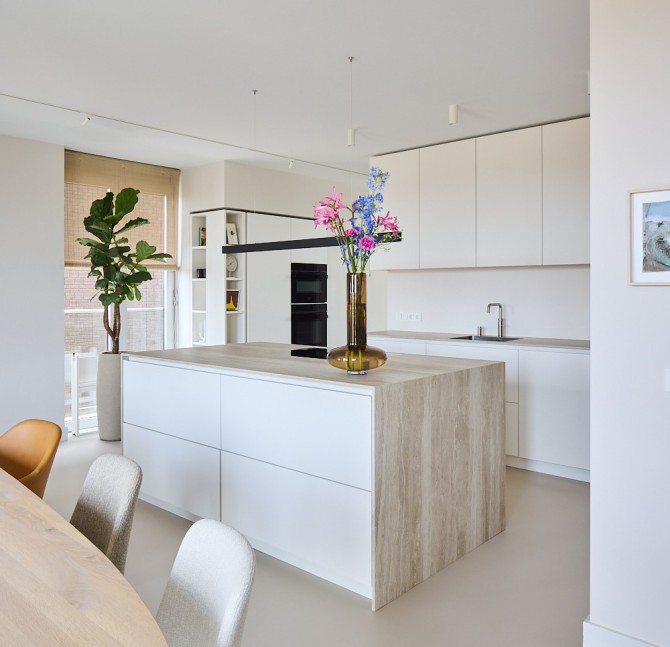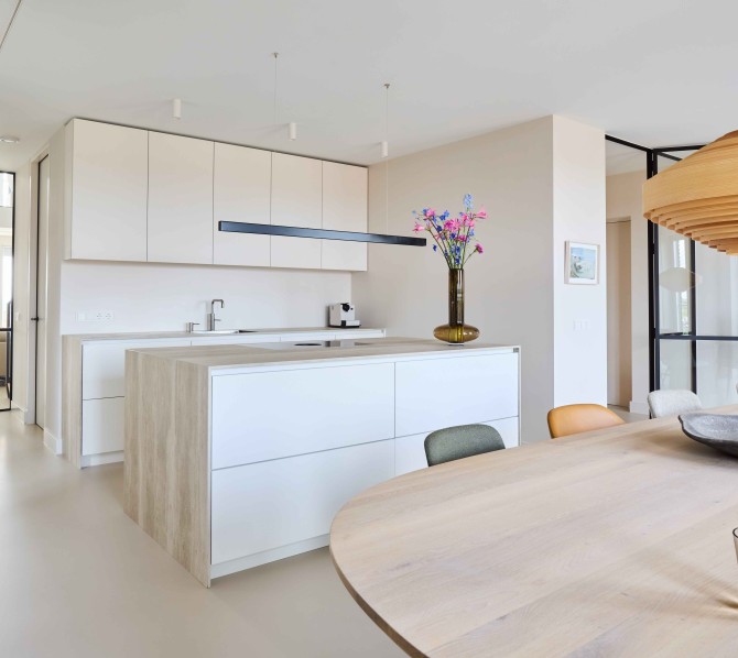 De bewoners houden van lichte en natuurlijke materialen. We hebben gekozen voor een aantal materialen, die in het hele appartement terugkomen: een lichte gietvloer, hout, staal en glas vormen de basis voor dit tijdloze interieur. In dit project hebben we nauw samengewerkt met Carlos in Huis. Het maatwerk en het meubilair vormen een mooie eenheid.