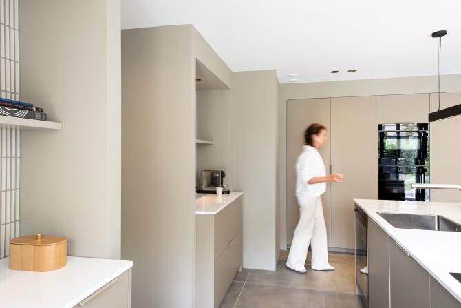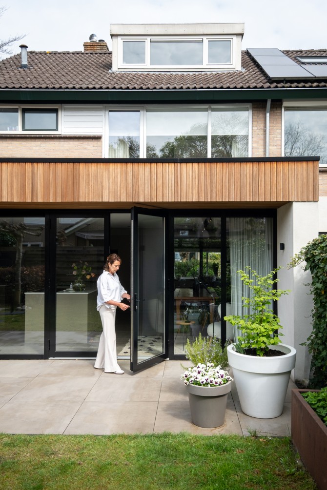 Dit zeventiger jaren huis in Bathmen was in 1992 al een keer verbouwd. Deze uitbouw was niet goed geïsoleerd en te klein voor de gewenste functies. In ons plan hebben we de uitbouw gesloopt en een grote nieuwe aanbouw gemaakt met een brede pui. Hierdoor ontstaat er ruimte voor een grote leefkeuken en is er optimaal contact met de tuin. De uitbouw heeft een overstek, de houten latten lopen door in het buitenplafond. Door consequent een aantal kleuren en materialen door te voeren ontstaat een tijdloos beeld. De verlichting is deels functioneel en voegt accenten toe aan de ruimte.