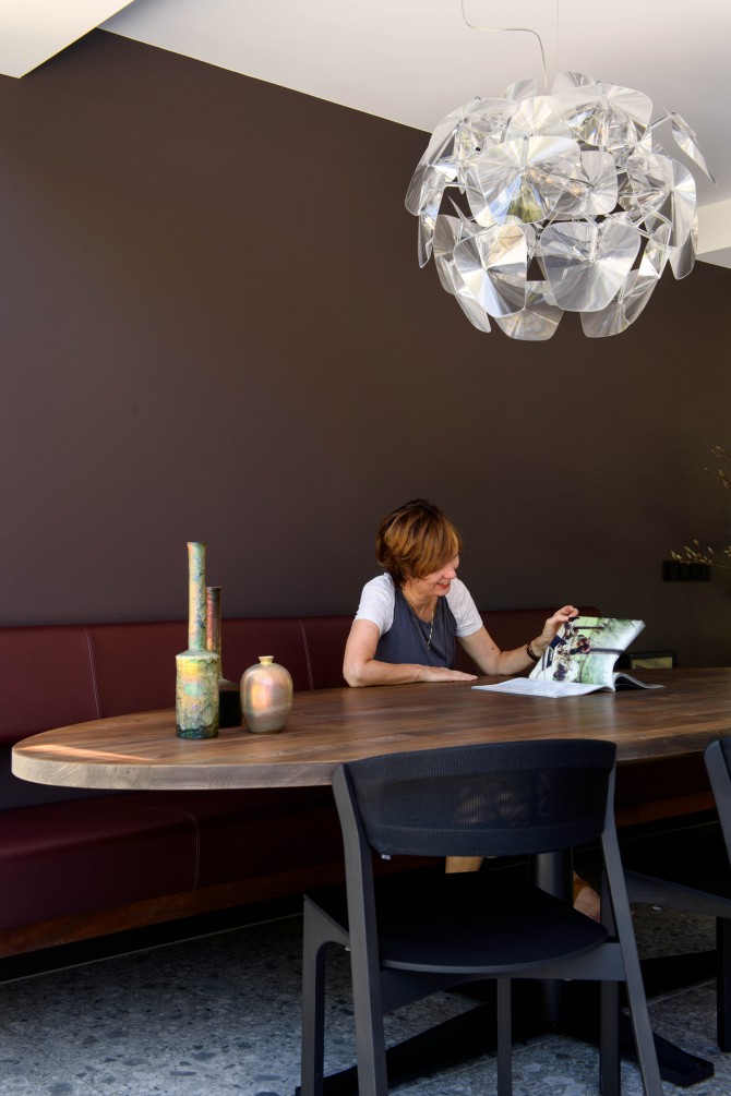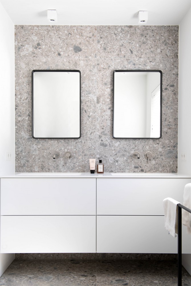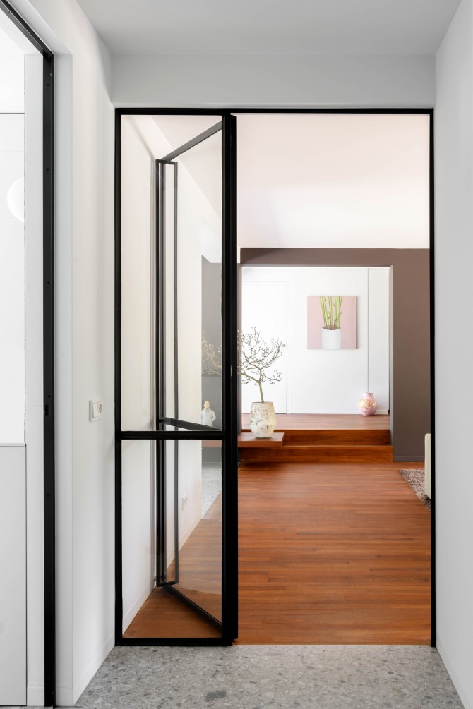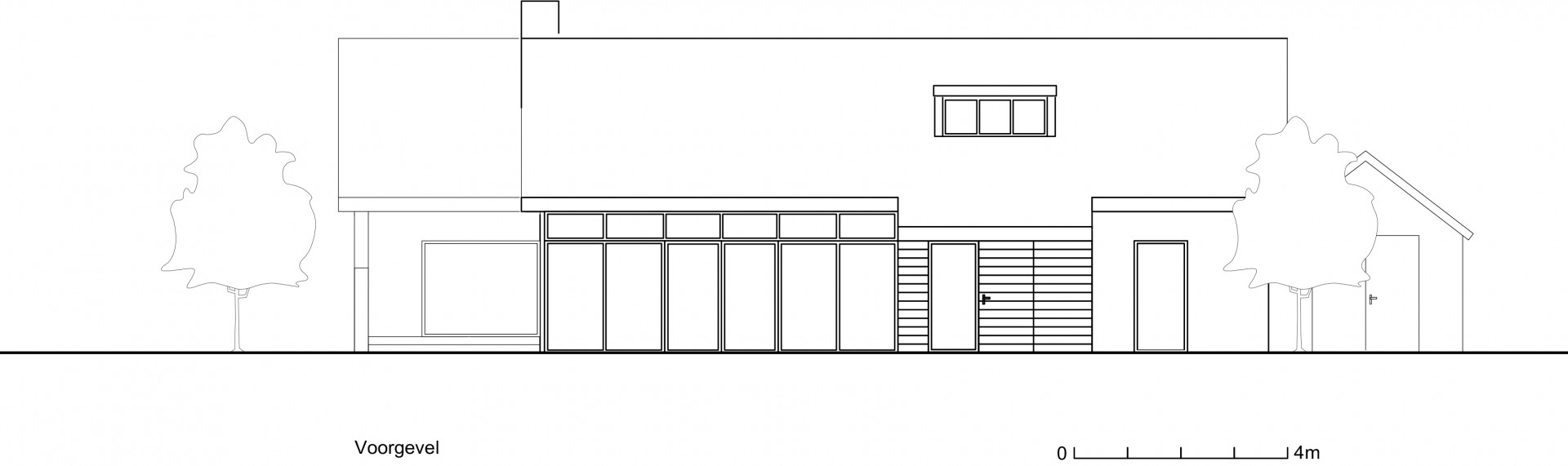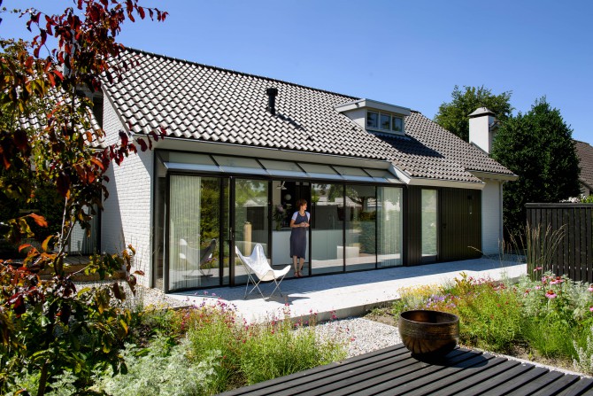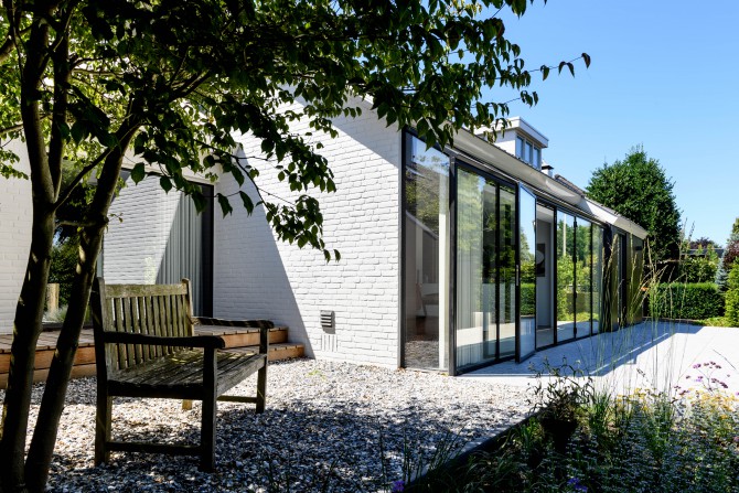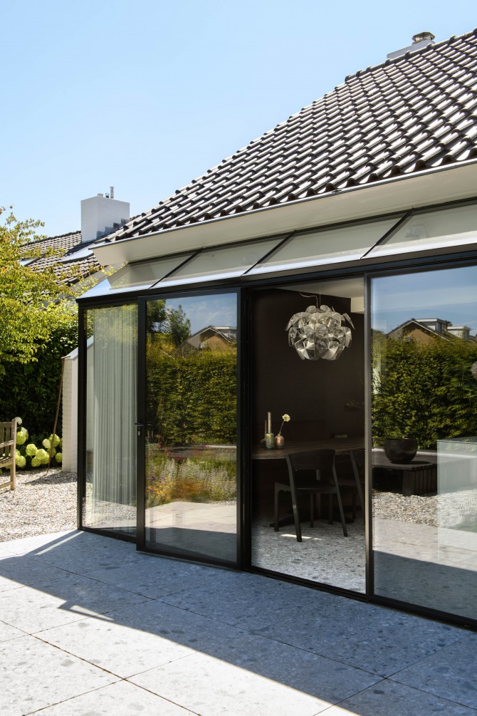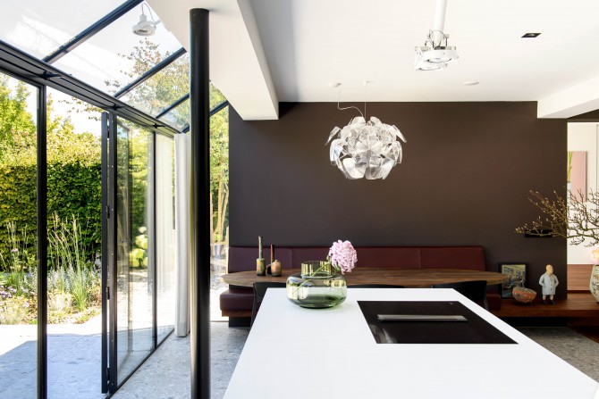 Optimale verbinding met buiten, dat was de wens van de opdrachtgever. De gevel aan de voorzijde was gesloten en er was nauwelijks contact met de voortuin. De nieuwe glazen uitbouw is niet groot in volume, maar heeft wel een enorme impact op de beleving van de ruimte. De nieuwe vloer loopt door in het terras aan de keuken, dit vergroot de ruimtelijkheid. Het contrast van de lichte keuken en de donkere wand geeft de ruimte karakter. Ook de badkamer is verbouwd en uitgewerkt in hetzelfde materiaal.