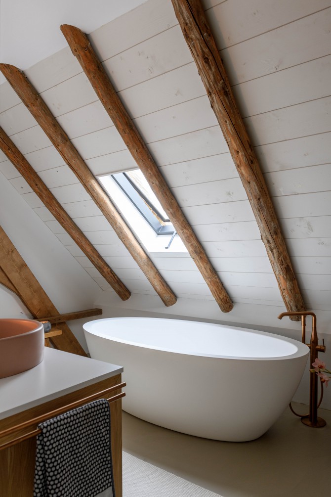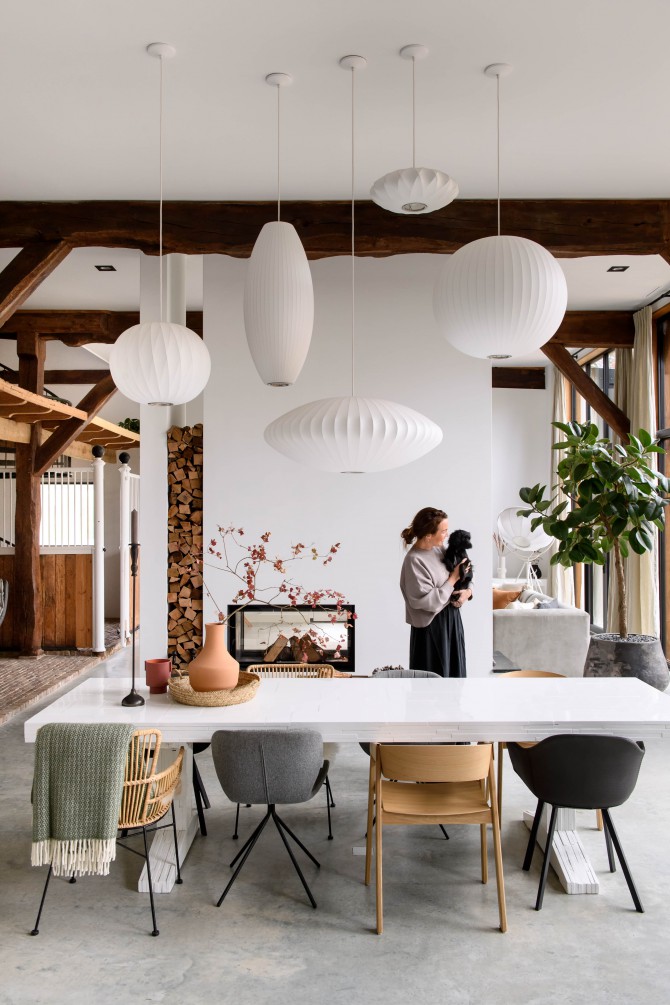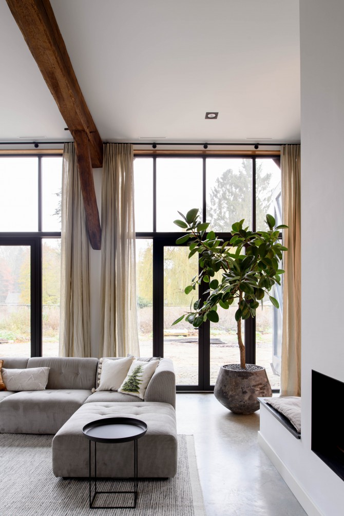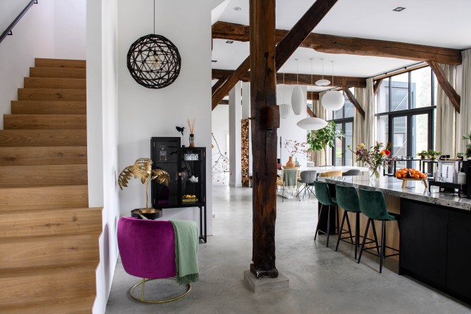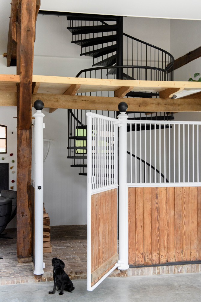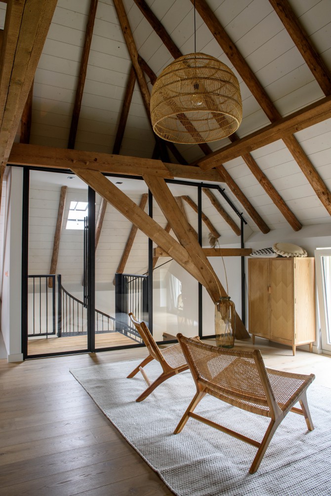De liefde voor de plek, dat gaf de doorslag. Onze opdrachtgevers kochten dit landgoed in Gelderland en zagen allerlei mogelijkheden om het met respect weer tot leven te wekken met minimale impact op de natuur. Ze vroegen Studio Groen+Schild om een ontwerp te maken voor de transformatie en de restauratie van het Koetshuis en mee te denken over het landgoed. Het koetshuis uit 1921, een gemeentelijk monument, is getransformeerd tot woning. Tezamen met de kapschuur vormt dit karakteristieke gebouw een waardevol ensemble op het landgoed, waar het landhuis jaren geleden is afgebroken. In de hoofdbeuk van het koetshuis stonden vroeger de landbouwwerktuigen, nu is dit de woonkamer en keuken. In de zijbeuk waren de stallen en stonden de paarden. Eén van de stallen is bewaard en deel van de woonkamer. De asbesthoudende golfplaten zijn verwijderd en vervangen door een rieten kap. De met vakmanschap gemaakte kap geeft het koetshuis zijn historische allure terug. De oorspronkelijke hooiluiken zijn nu de ramen van de slaapkamers. In de stal staat een nieuwe wenteltrap die de woonkamer met de hoofdslaapkamer verbindt. De oorspronkelijke hildes en de IJsselsteentjes in de stal zijn behouden. Naast de restauratie is het gebouw vanaf de binnenzijde geïsoleerd en voorzien van een warmtepomp. De hoge puien verbinden aan de zuidzijde binnen met buiten. Met de grote, gerestaureerde, staldeuren is deze gevel volledig te sluiten. Het resultaat is een licht, ruimtelijk en comfortabel huis met historische elementen op een bijzondere plek.