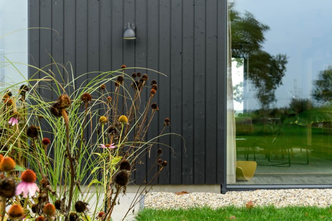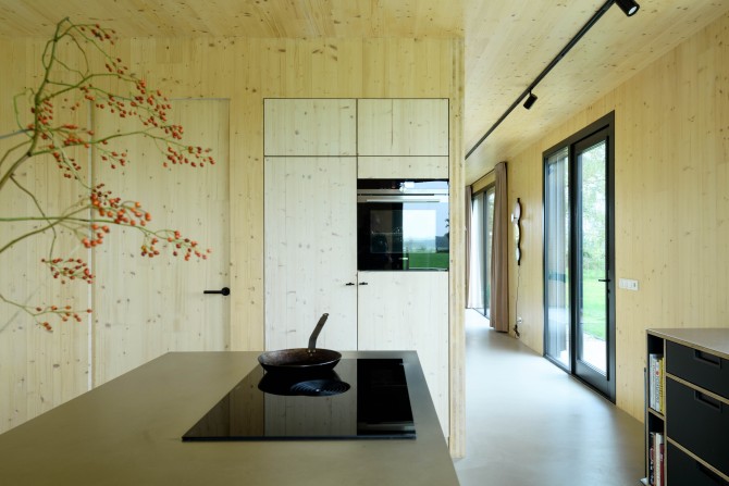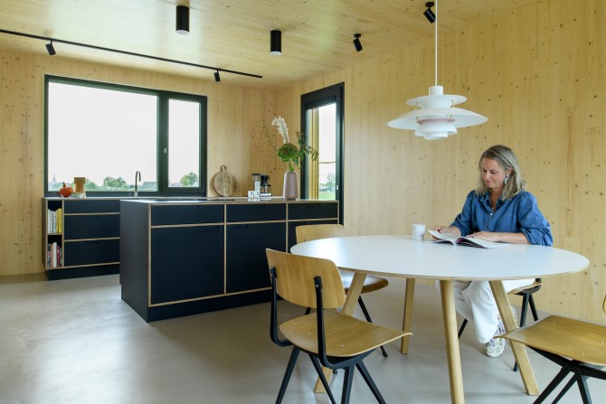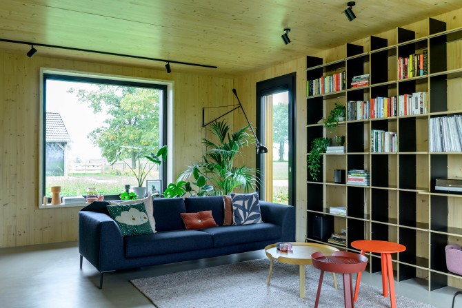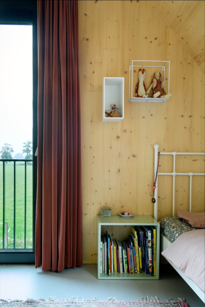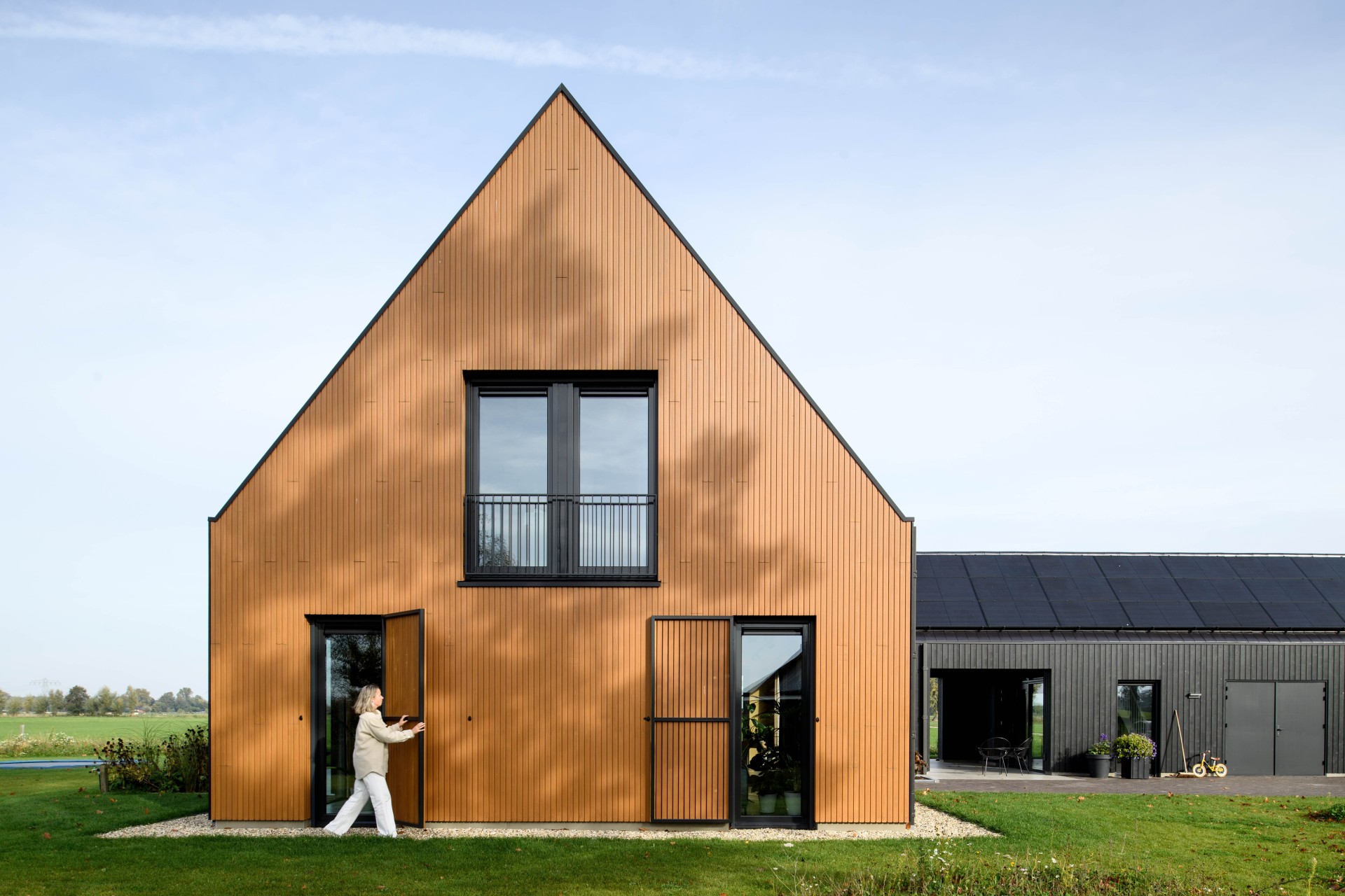 In het buitengebied van Wijhe kwam via een rood voor rood regeling ruimte voor een nieuw huis op een bestaand erf. Het erf ligt aan de rand van het oude Sallandse hoevelandschap en gaat langzaam over naar het rivierenland. Een prachtige plek, die aanleiding gaf om het huis met bijgebouw zo te draaien, dat vanuit het huis optimaal zicht is op het landschap. De bewoners, een stel met drie jonge kinderen, hadden de ambitie om een zo duurzaam mogelijk huis te laten bouwen. Gekozen is om het huis prefab te laten bouwen van constructief hout, CLT. Dit materiaal vervangt staal en beton en is in de toekomst herbruikbaar. De houten elementen zijn aan de buitenzijde bekleed met verduurzaamd houten latten en aan de binnenzijde in een zichtkwaliteit uitgevoerd. De houten wanden en plafonds geven sfeer aan de ruimtes. Door in het midden van het huis een volume te plaatsen waar de trap, bijkeuken en installaties in zijn opgenomen, ontstaat daar omheen veel open ruimte. De overloop op de verdieping is ruim en fungeert ook als werkruimte. Tussen het bijgebouw en het hoofdhuis is een deels overdekt terras, waar je heerlijk beschut kunt zitten.