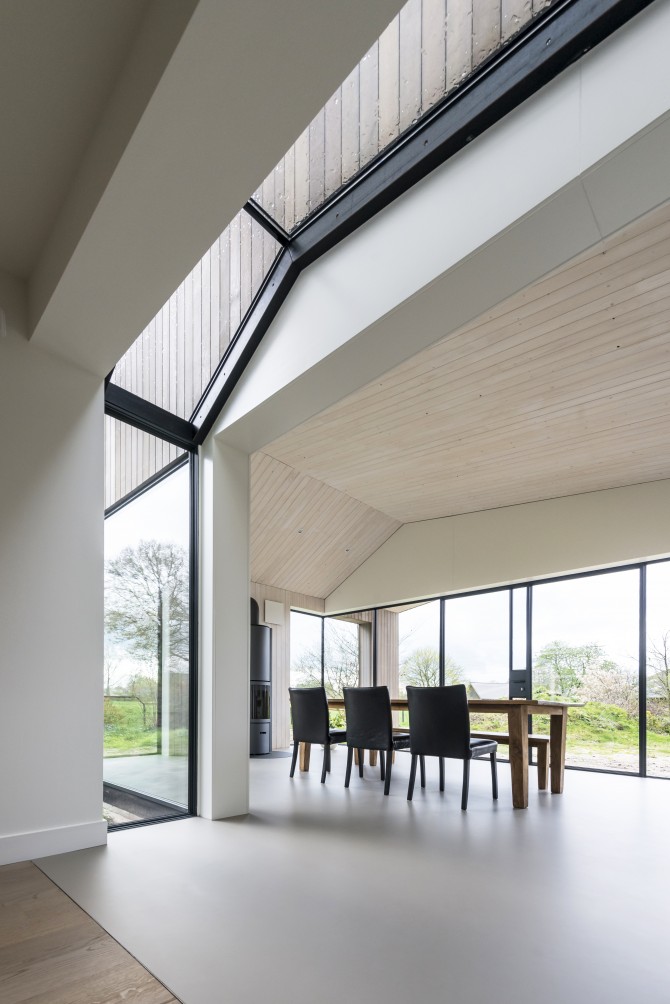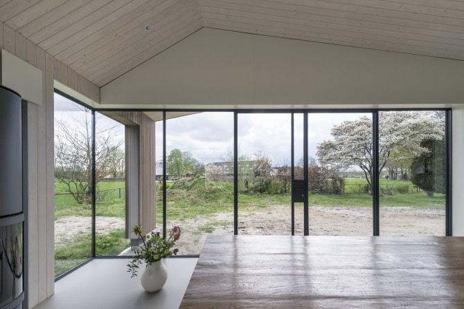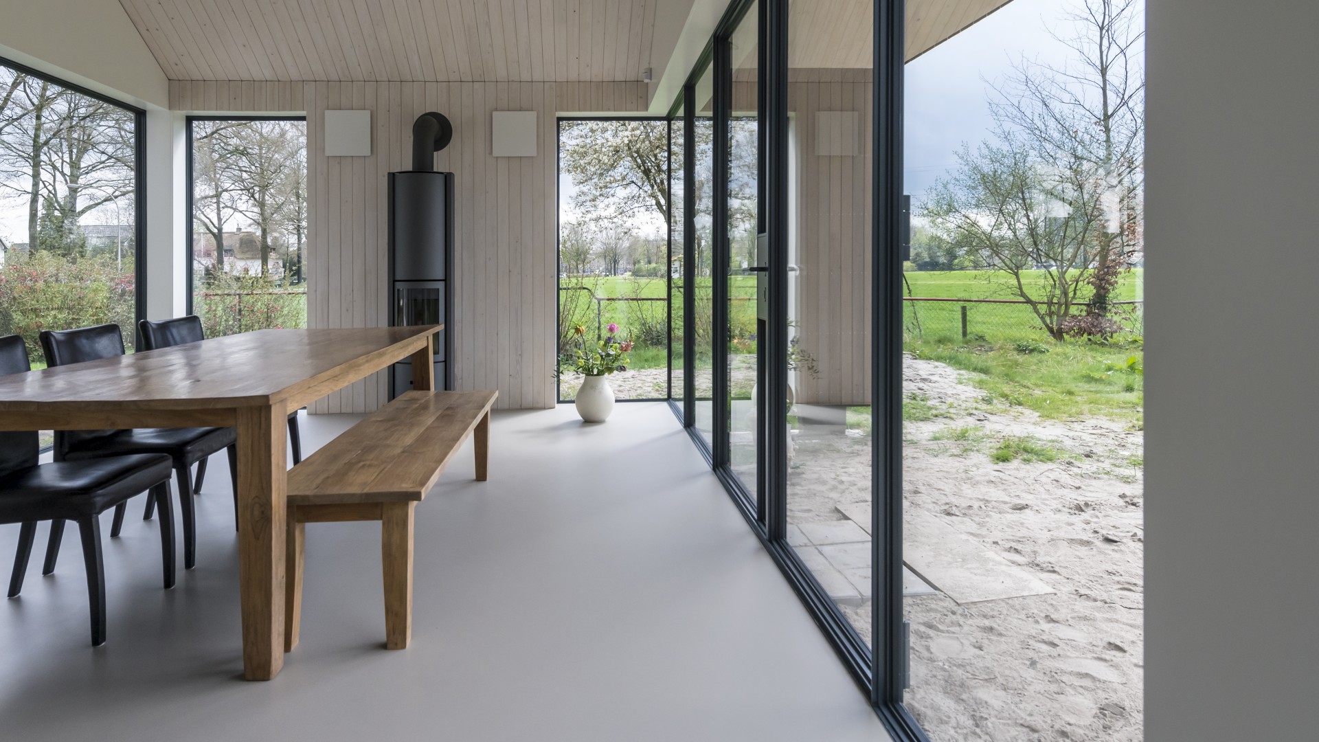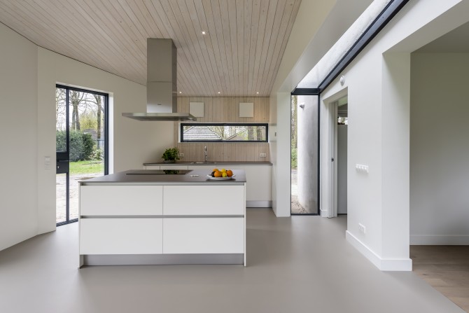 Maximaal contact met de natuur, dat is wat onze opdrachtgever voor ogen had met de nieuwe uitbouw. Het oorspronkelijke huis uit de jaren dertig van de vorige eeuw was in de loop der jaren twee maal verbouwd. De laatste uitbouw, een praktijkruimte, stond midden in de tuin en was erg gesloten. Deze uitbouw is gesloopt om plaats te maken voor een nieuwe tuinkamer. De vorm met schuine lijnen is ontstaan vanujit de zichtlijnen naar de omgeving. De materialen zijn eigentijds en duurzaam, hout en isolatie met vlas. Het hout is binnen en buiten toegepast en loopt door op het dak. De glasstrook tussen het nieuwe en oude deel geeft extra licht in de keuken. De ruimte wordt verwarmd en gekoeld vanuit de vloer. Hierdoor zijn er geen radiatoren voor de puien en is er maximaal contact met buiten. Het is alsof je, zelfs hartje winter, in de tuin eet: precies wat onze opdrachtgevers wilden!