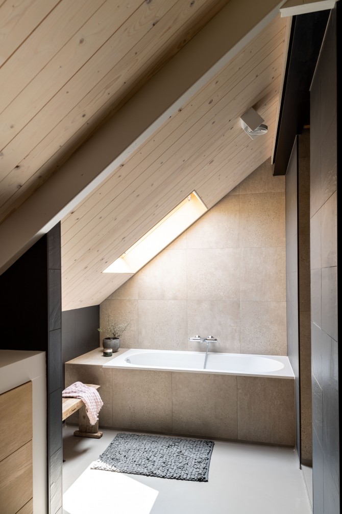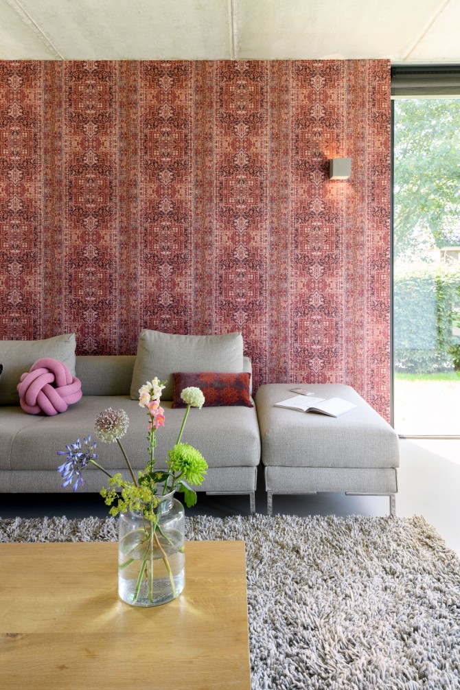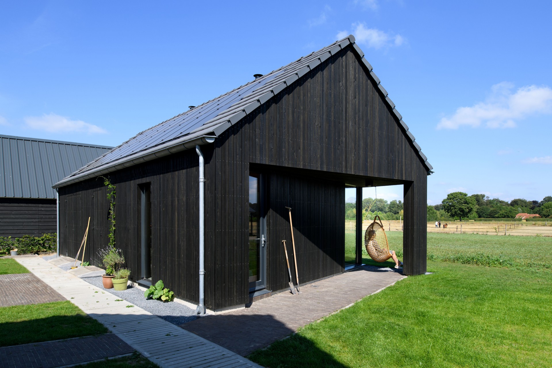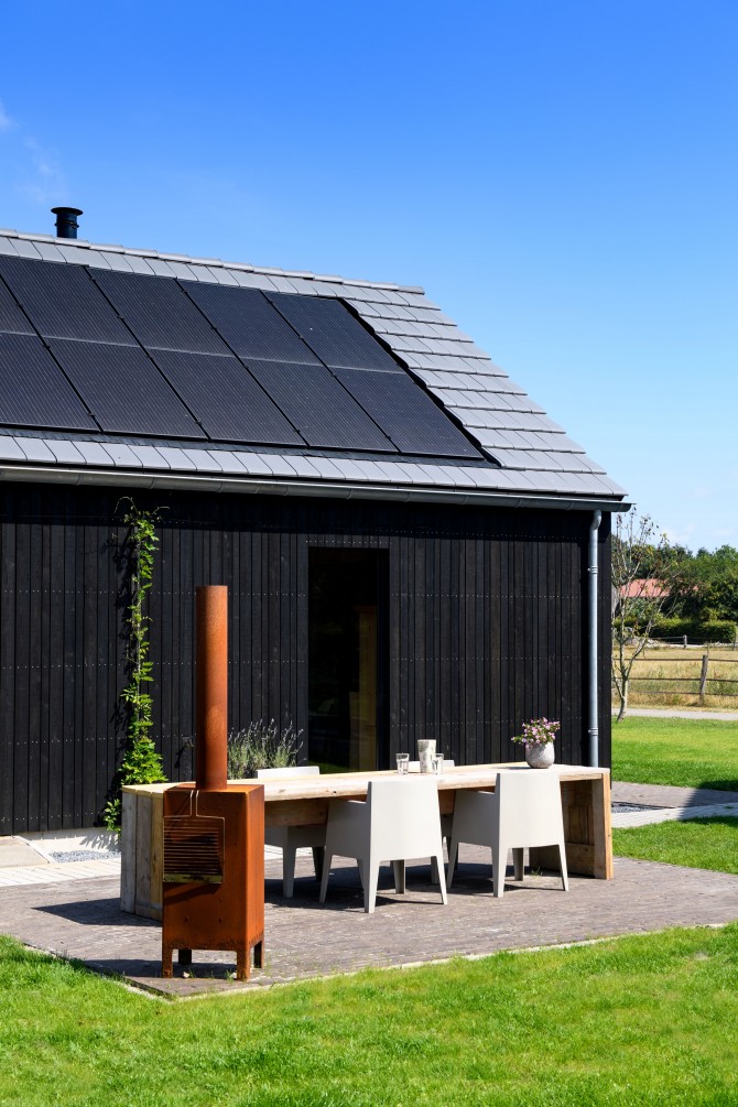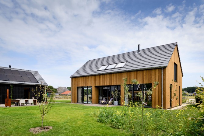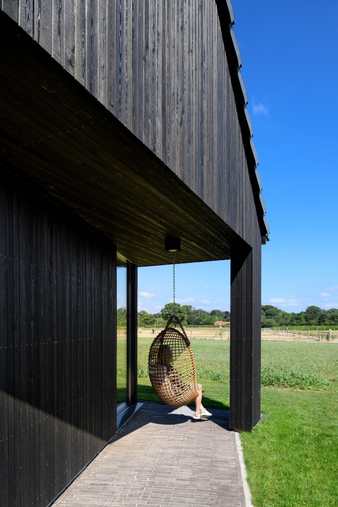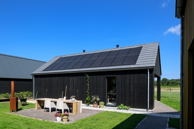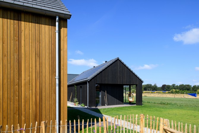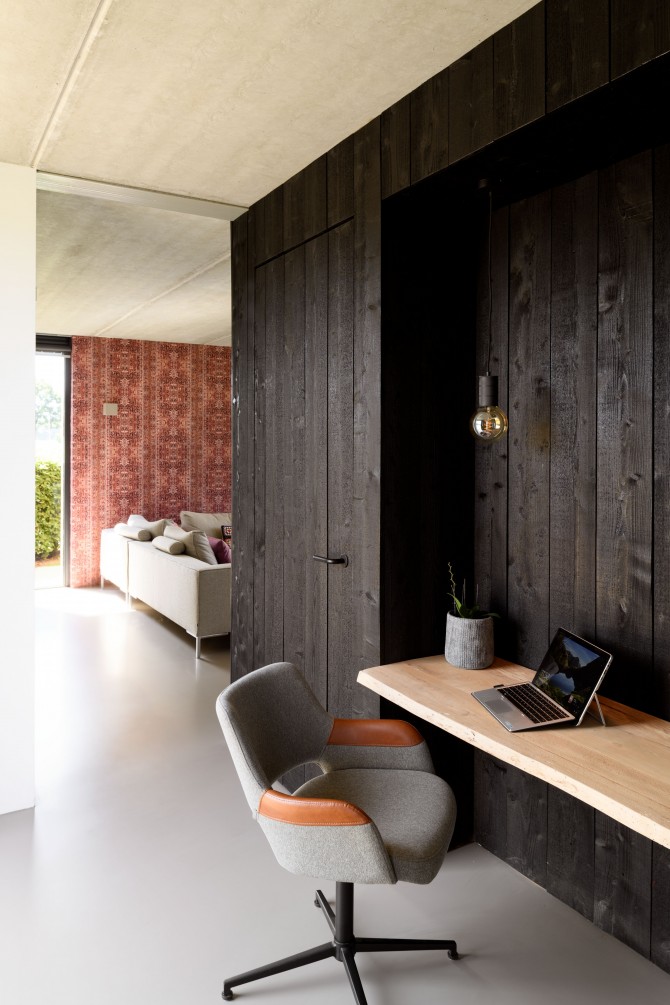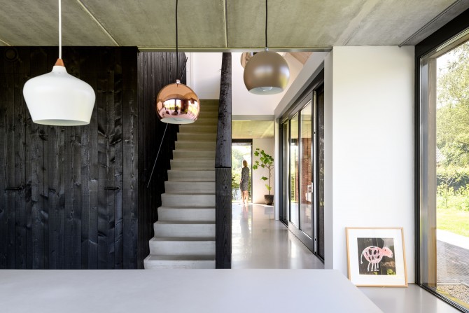 In het buitengebied bij Diepenveen kwam via een Rood voor Rood regeling ruimte voor een nieuw huis. Waar eens de stal stond staat nu een schuurwoning met een hoofdhuis en een bijgebouw. Het hoofdhuis is opgebouwd uit naturel hout en het bijgebouw, dat lager is, is bekleed van zwarte planken. De zonnepanelen zijn geïntegreerd op het dak van het bijgebouw. De bewoners van het huis, een gezin met twee dochters, wilden een comfortabel modern huis met veel ruimte en licht. Door in het midden van het huis een volume te plaatsen waar de trap, bijkeuken en installaties in zijn opgenomen, ontstaat daar om heen veel open ruimte. De kern is bekleed met planken met daar achter akoestisch materiaal. Hierdoor wordt het geluid geabsorbeerd en kon het ruwe beton in zicht blijven. Een mooi contrast met het kleurrijke en decoratieve behang.